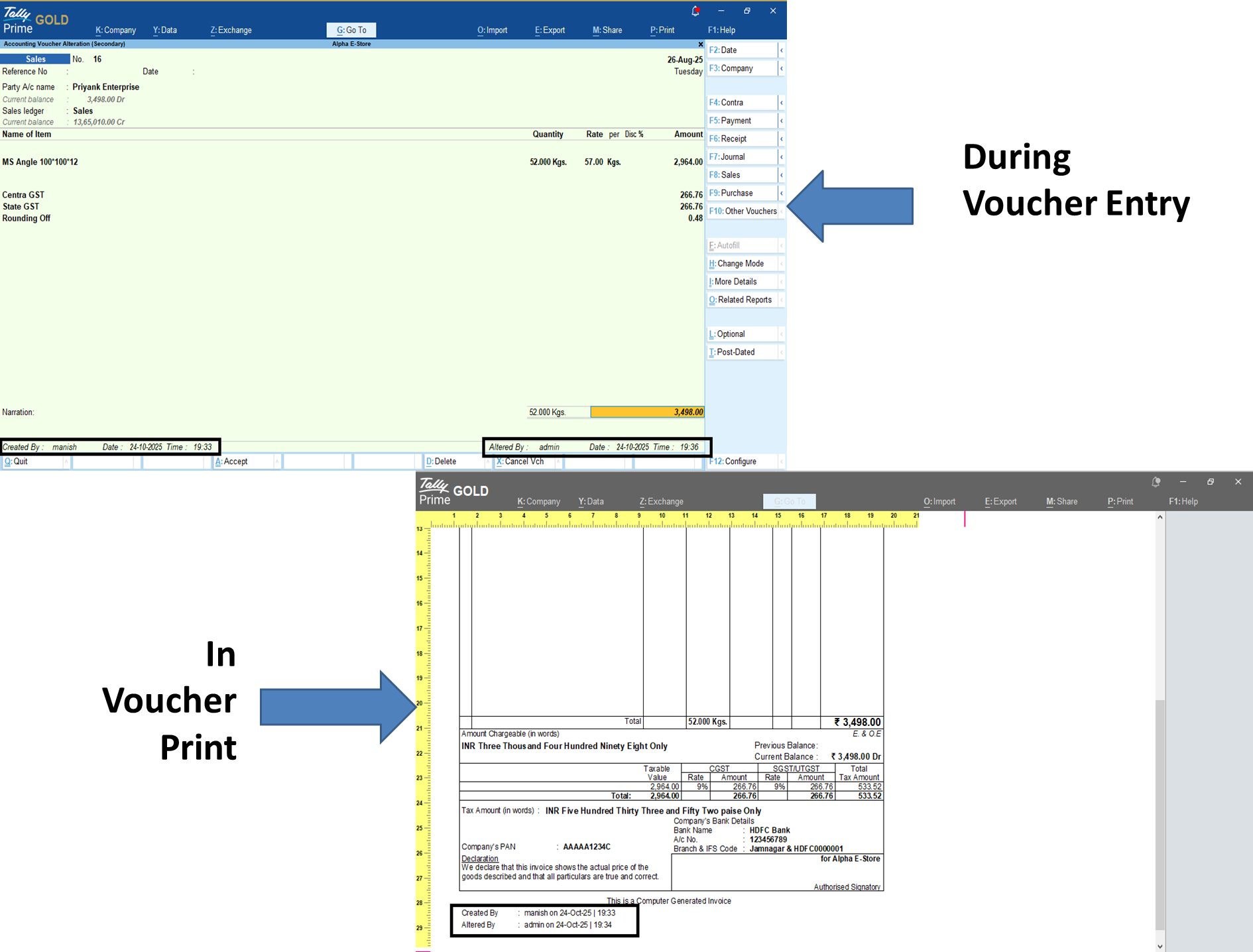 This add-on facilitates user to view the details of Created by and Altered by User Name along with Date and time in Voucher Screen. It helps to find user name and time details in voucher itself. No need to go for any another report. User can also print Created by and altered by User Name along with Date and Time on voucher.