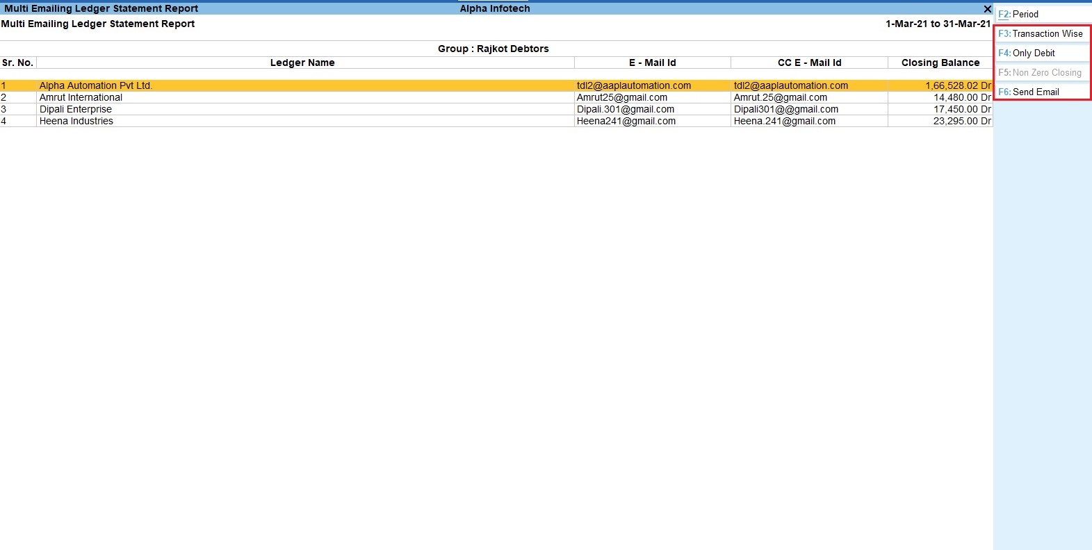 This add on prints GST number of all parties in ledger outstanding report. Report is available in both Receivable and Payable Outstanding Reports and Ageing Report also. Useful when Outstanding Amount to be given to Bank or any other Authority along with Party name and GST Number.